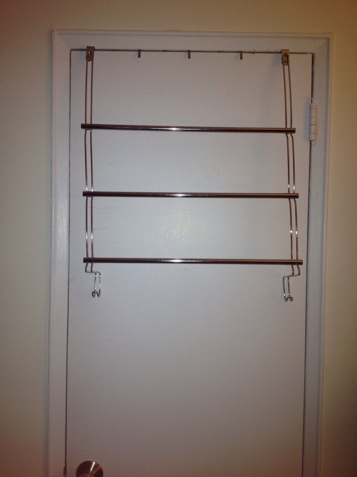Here is a picture of the new over-the-door towel rack (only cost $9.99). It features 2 hooks on the bottom for additional hanging.