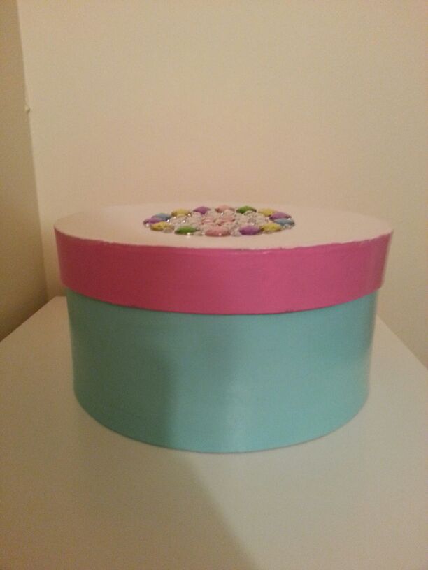 I painted the box 3 colors, pink, white and turquoise and glued some jewels on the top for an added touch! I wanted to cover the entire box top with jewels, but I didn’t have enough π