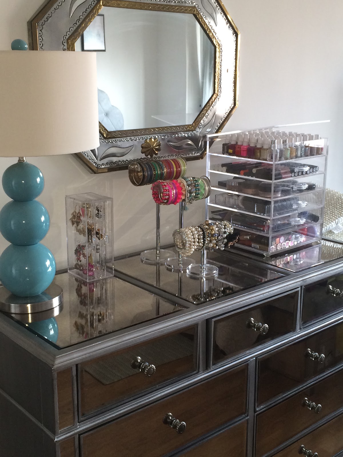 | BEFORE: This is how I used to have my dresser set up. I love the glass canisters, but I had to dig in them to find bracelets. |