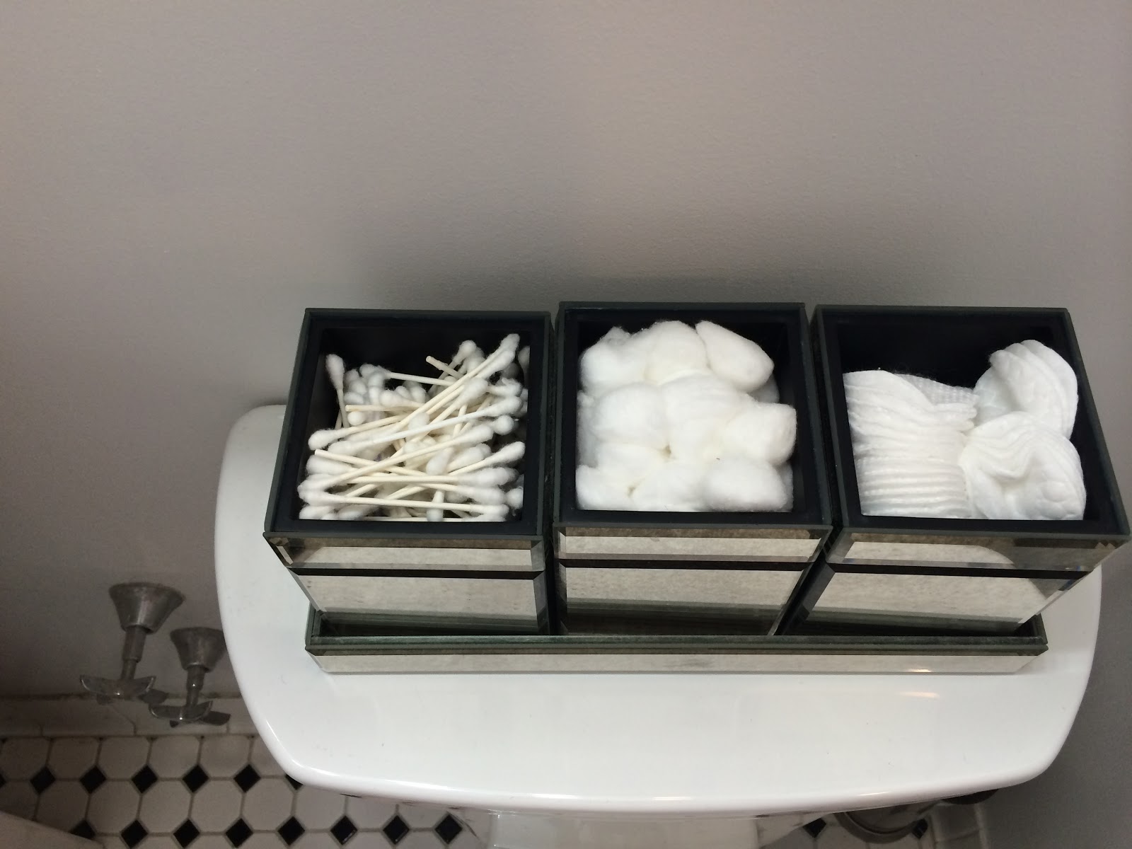 Happy Wednesday Everyone! I am very excited to share my latest organizing project, something super simple and easy to do. If you know me or can tell by my posts, I love glass; glass furniture, decorations, jars, vases, whatever! In the past, before I had my amazing Clear Cube acrylic makeup organizer, I used apothecary jars to organize my makeup, nail polish and accessories. For some reason, I always use glass jars in sets of 3, not sure why, but that seems to be the magic number! Please take a look at the various ways I have organized my kitchen and bathroom using glass jars of some sort and let me know what you think! If you haven’t already, please check out my page on Instagram @cosmopolitanclosets and on Pinterest, the button is located on the right side of the page 🙂