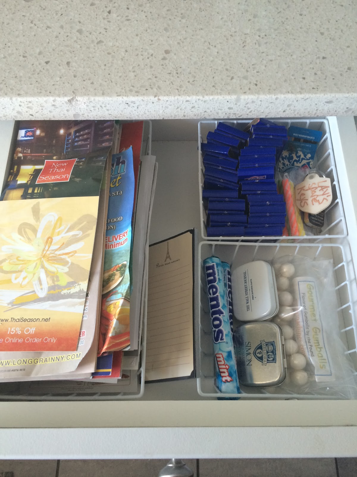 AFTER: The finished product! Took all of 20 minutes to clean out my drawer and organize my menus, matches and mints!
