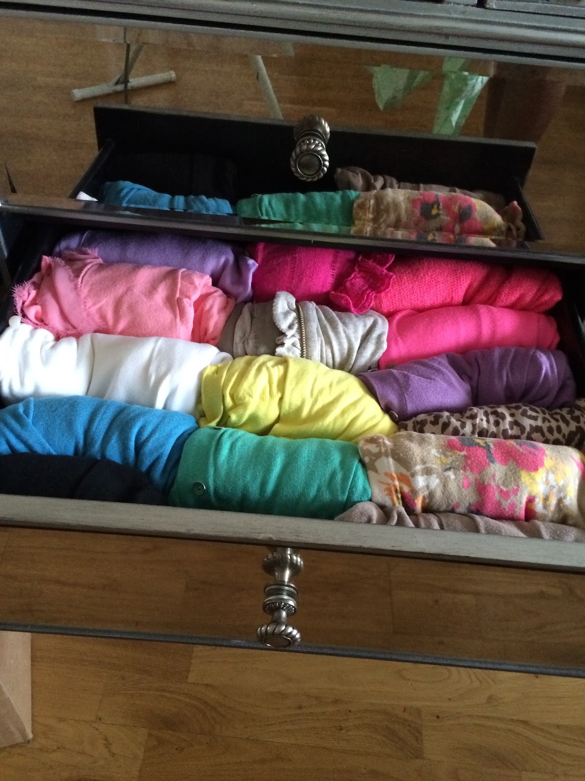 Colorful cardis rolled in the drawer!