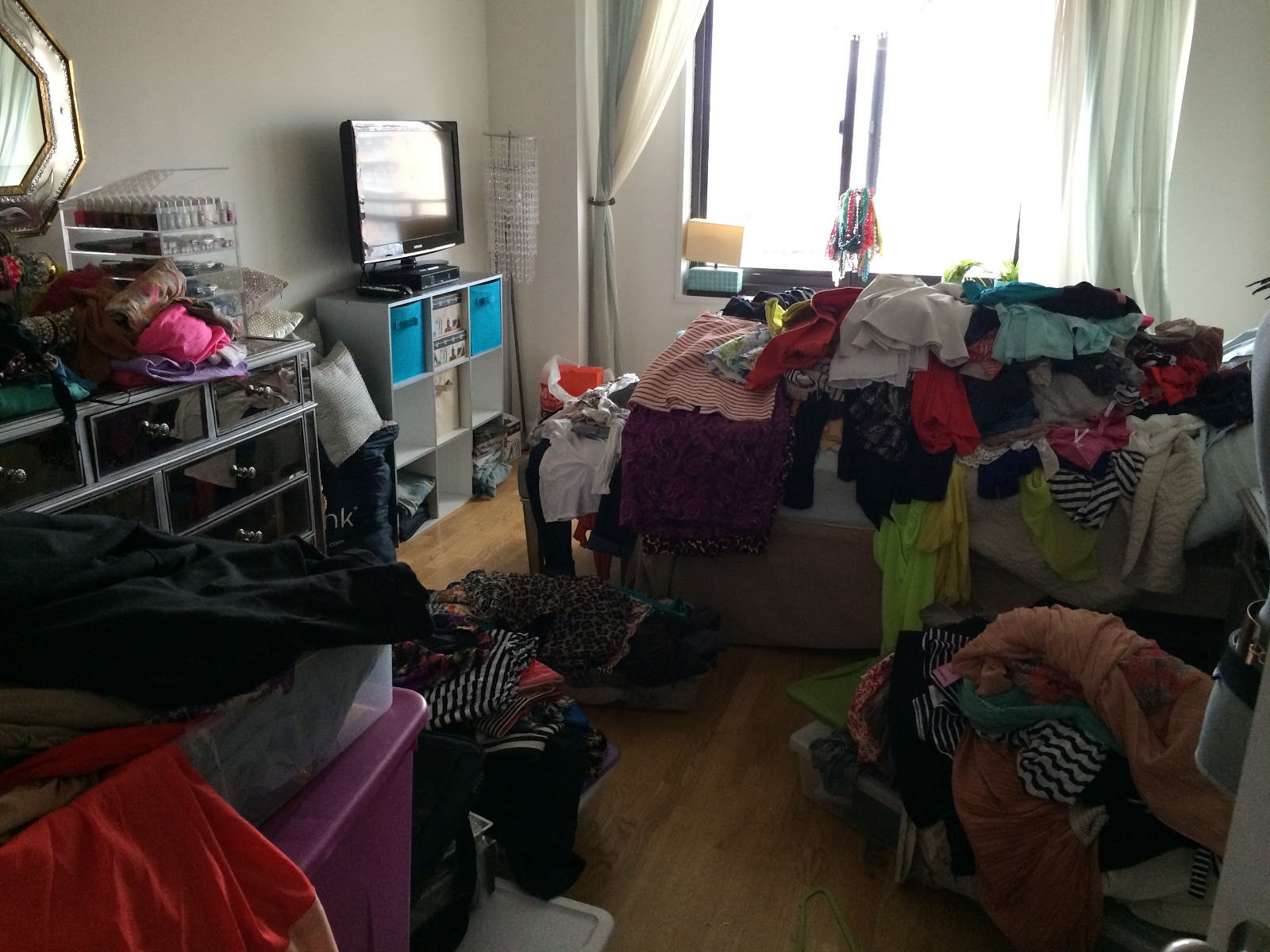More pics to come later, but I store my clothes under the bed in long, flat totes, as well as in the closet in larger totes, that house winter skirts, sweaters, shirts, boots and accessories!
