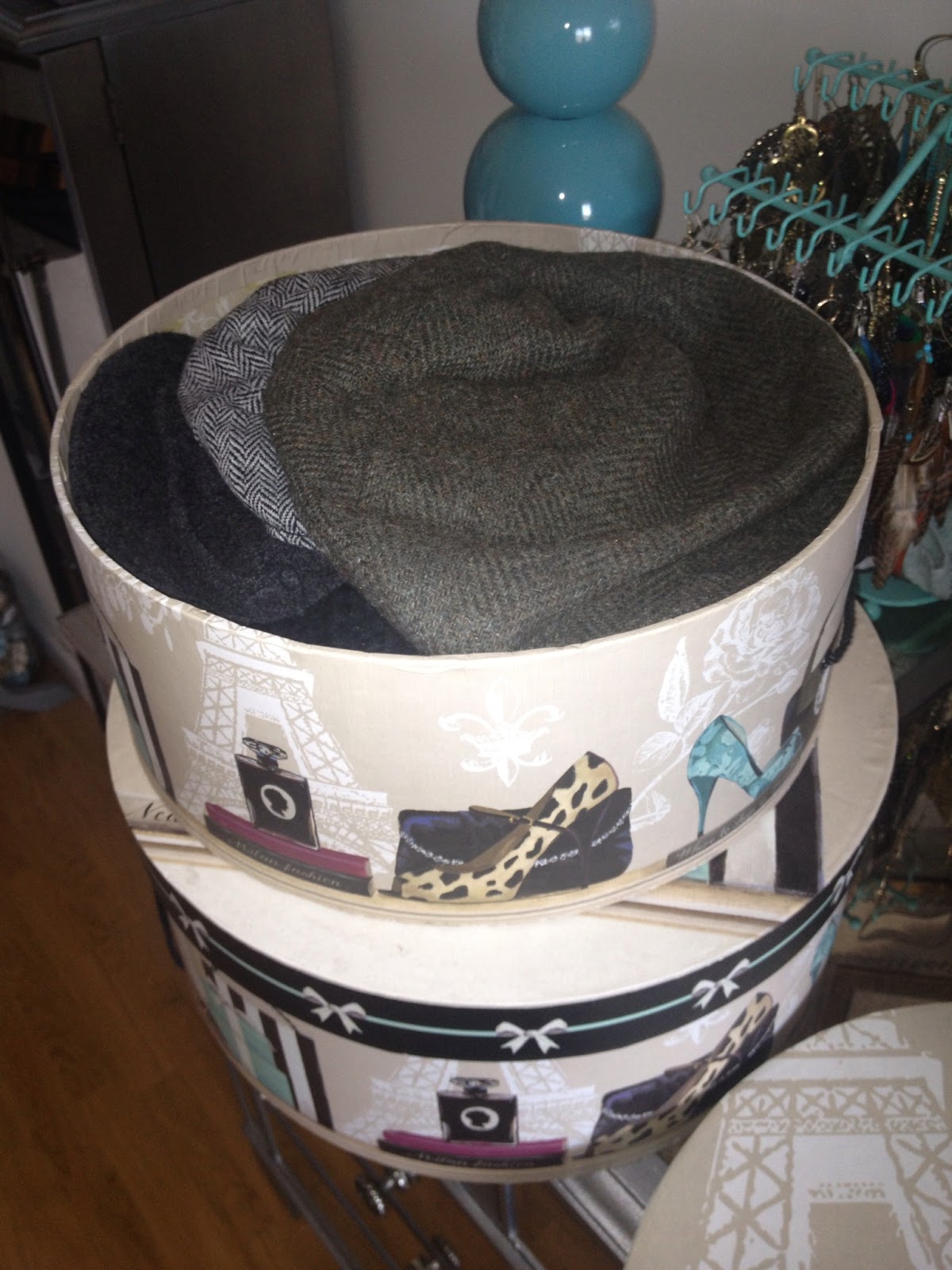 Here is another pic to show how they fit inside, I have about 8 hats in one box. Stores like Marshalls, Homegoods, Burlington Coat Factory and Bed, Bath and Beyond have a nice selection of decorative storage boxes and if you can’t find one you like, why not customize it yourself (check out this post for details on how I did one for my cousin here.