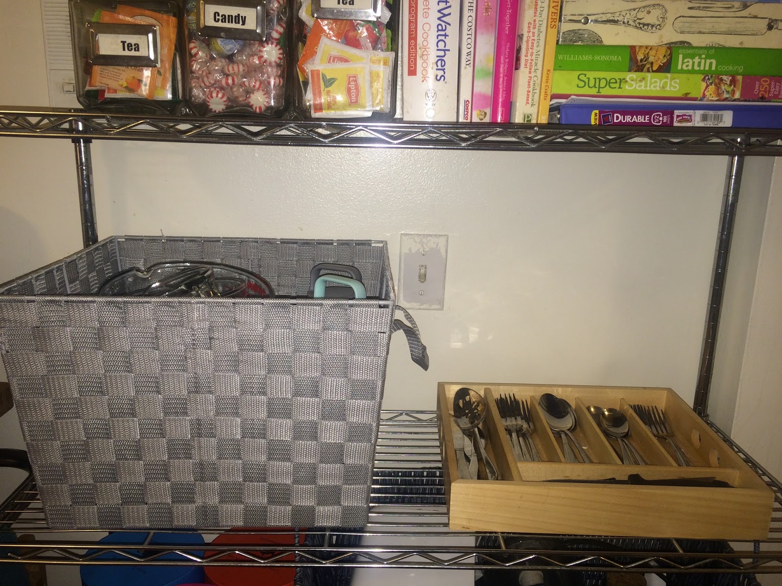 2nd Shelf – I decided to put the silverware here for easy access, plus we only have 2 drawers in the whole kitchen, lol. Also, I found this gray basket at Homegoods and it has glass mixing bowls and glass measuring cups. Still trying to decide if I like the basket, but it gets the job done.