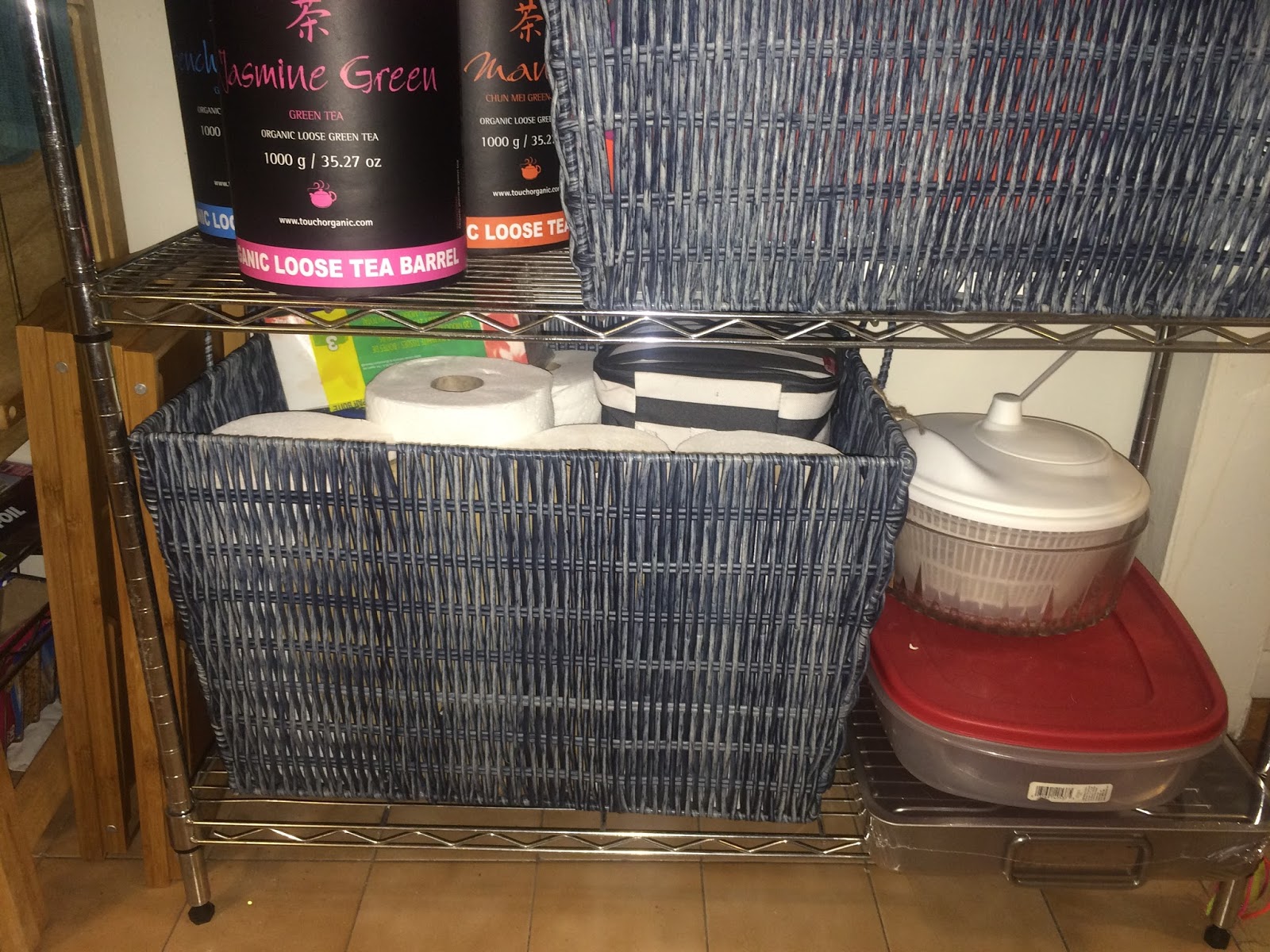 Bottom Shelf – Home to another basket that houses kitchen supplies, like papertowels, tissues and napkins, plus my striped lunch bag. There are a couple items next to the basket that are still looking for a home, but otherwise my organizing is complete. I find the items inside the baskets easy to access, but out of sight so that they aren’t falling all over the place.