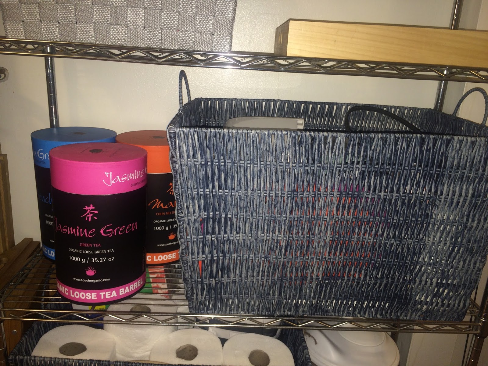 3rd Shelf – This shelf has 1 of the 2 baskets that I love from Homegoods for $24.99 each. They fit perfectly on the shelf and are super sturdy. I have glass baking pans (we have about 10 of them in different sizes) plus some cutting boards and a mandoline. The basket shares the shelf with these ginormous loose tea containers (found at Homegoods as well) we got over the holiday season. We are huge tea and coffee drinkers, so the tea is a must and trust me, we will drink it all 🙂