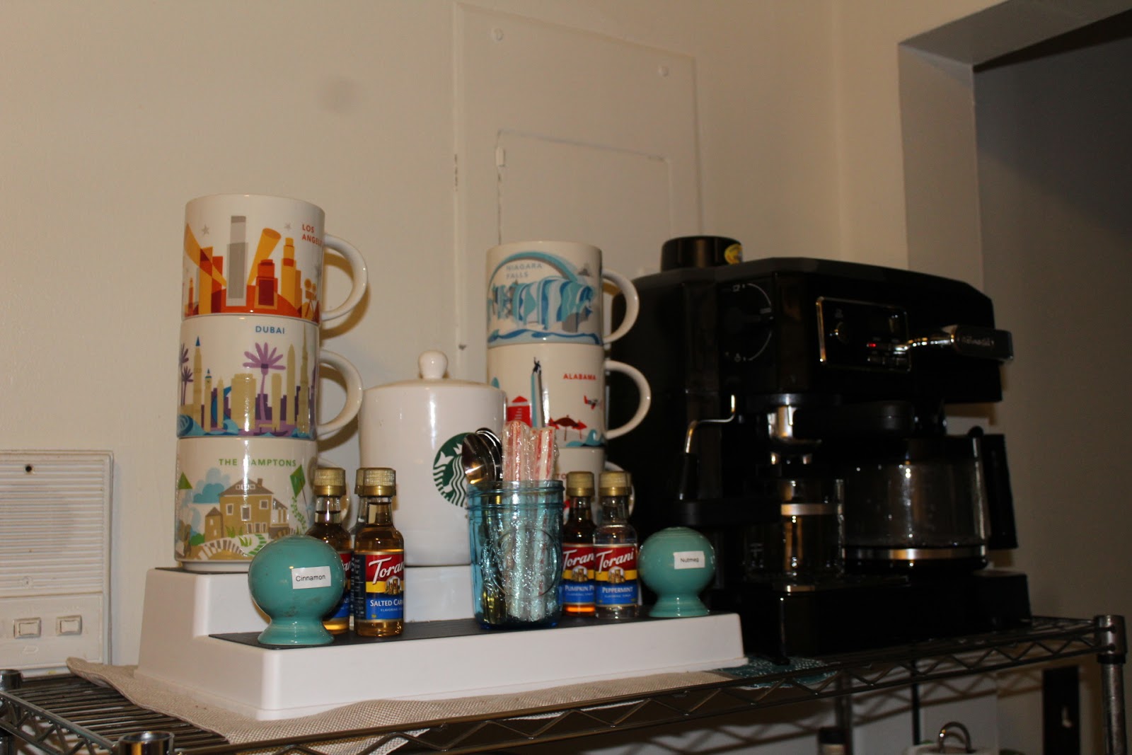 When I received my new espresso/cappuccino/coffee-maker last year for my birthday, I immediately wanted to create a little space, aka coffee bar, on my wire rack. It was very simple to do and below I listed all the accoutrements needed! Check it out and let me know what you think! As always, thank you for reading/sharing/liking 🙂