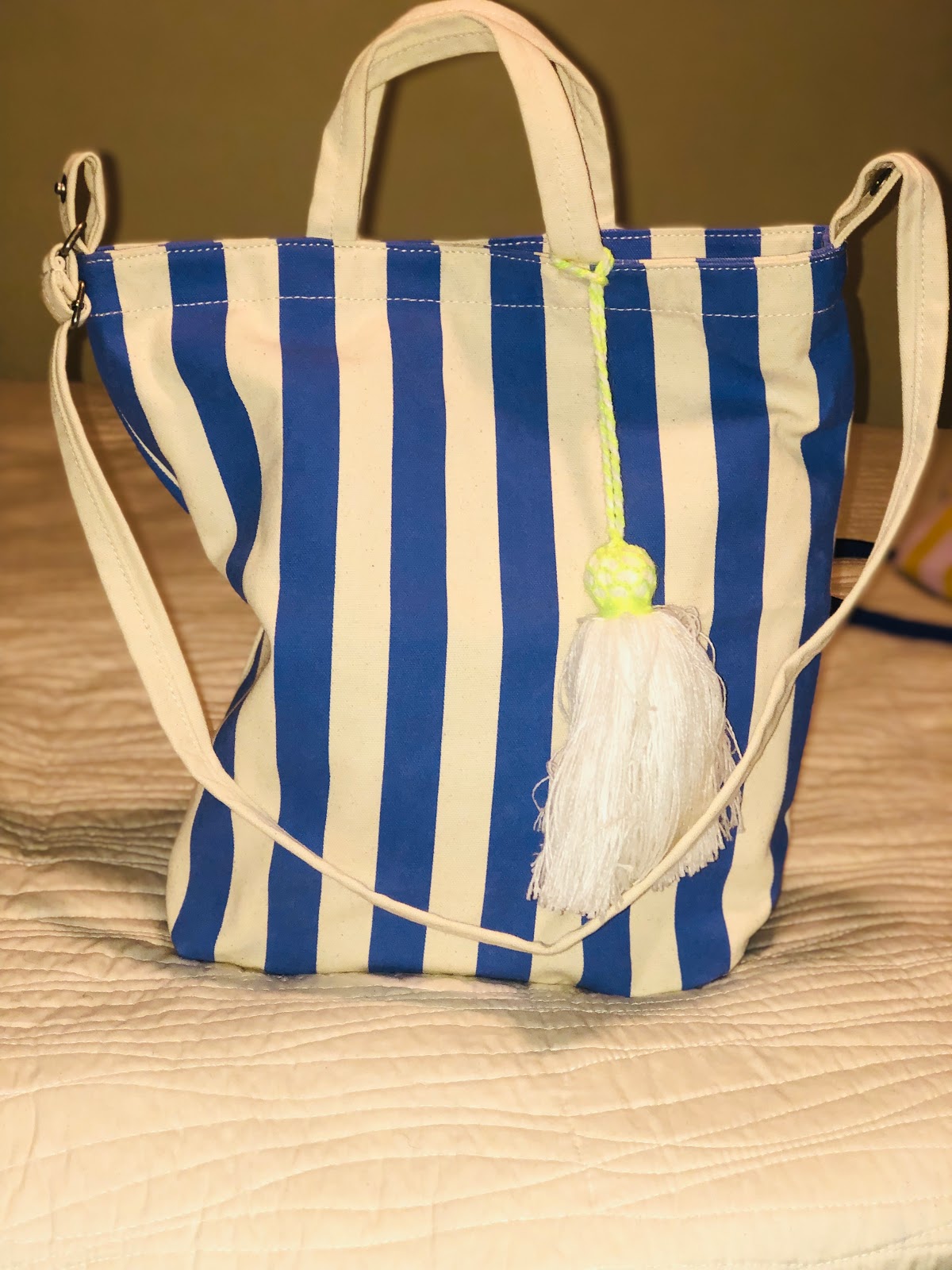 Here is the weekend bag- I added this cute tassel I bought in Morocco.