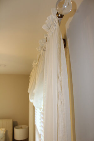 Décor Hack- I had this desk organizer originally for our shared office, but I decided to go with more wood and acrylic accents, so I repurposed it for a plant organizer! Found at World Market.I originally bought cream chenille curtains for the room – but then remembered I had these sheer ivory & gold curtains and valance from my days in Harlem! The curtain rod is acrylic & gold from Amazon. Once again – repurpose and reuse!