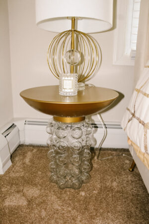 I cannot rave enough about this metal and glass TOV table. It is sooooo beautiful in person. I found these pretty gold and acrylic lamps by chance at Homegoods and they go perfectly! The bubble candles are from H&M.