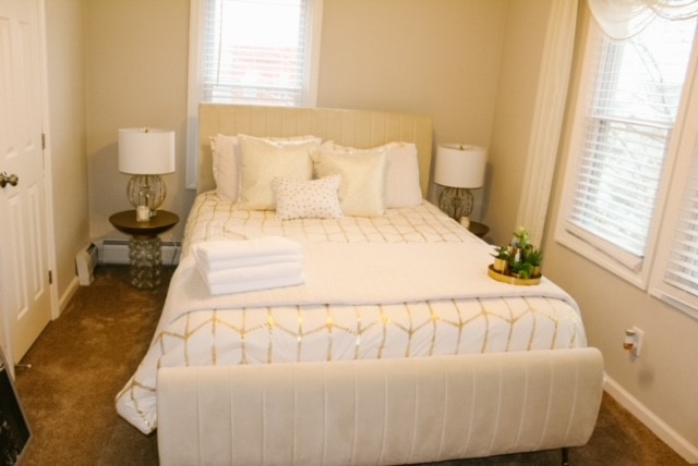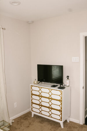 The first that I wanted to share was our guest room! I can’t believe we have an actual guest room, ha! I want the experience for any of our guests to feel like they are in a luxurious hotel room, with high quality linens, toiletries on demand and chic furnishings and I tried to accomplish this all while staying within our design aesthetic and budget. I had to work with the space that we have – no renovations to the upstairs just yet. Given that we live in an almost 100 year old colonial, all the bedrooms are the same size and shape with 3 windows so I knew a lot of furniture was not the plan. I wanted a neutral colored bed that made a statement and that was somewhat timeless so as our design tastes evolve, the furniture won’t be too trendy or dated. The house was freshly painted when we moved in and the bedrooms had new carpet installed. In the future, I plan to change the wall colors and rip out the carpet so that the beautiful wood floors can show through. For now, the focus was bed, mattress, side tables/nightstands, tv, linens, window treatments and a few small accents.