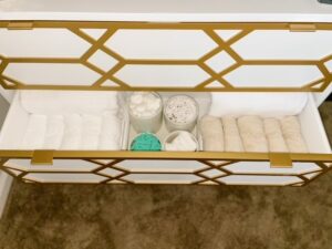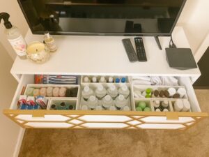 The top drawer is fully stocked with toiletries and bottled water, just in case a guest is thirsty at night! The travel size toiletries are stored in little bathroom organizers that I already had. If you’re curious about them, check out this post here.