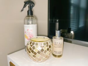 Last but not least, we have to keep our space smelling fresh and free from odor. I love the Caldrea and Opal room and linen sprays (found on Amazon and at Target). The beautiful candle is a gift from my aunt.